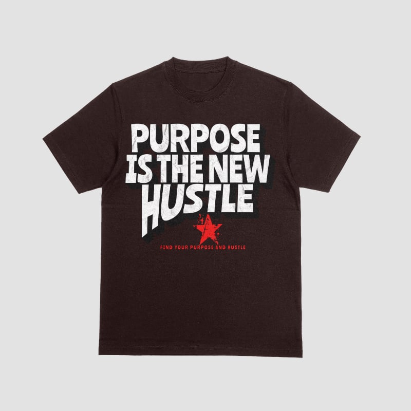 T-shirt features a bold motivational statement: “PURPOSE IS THE NEW HUSTLE” in distressed white lettering, accented with a striking red star graphic. Beneath the main design, the phrase “FIND YOUR PURPOSE AND HUSTLE” is printed in smaller red text for added emphasis.